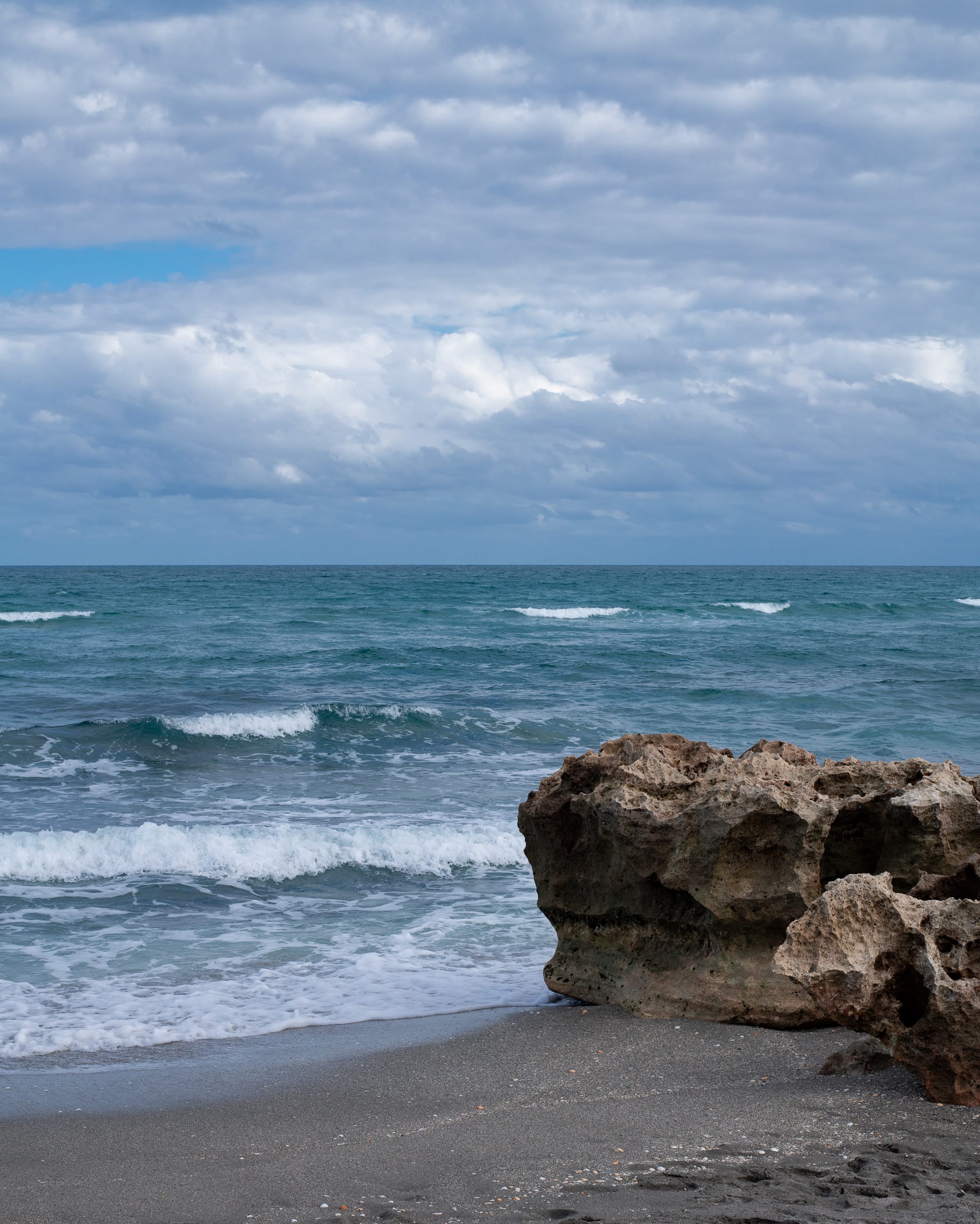 The rocks add beautiful texture and depth along the water’s edge, typically rising just a few feet above the sand. Depending on the tide, more or less of the shoreline rock will be visible, but the ocean backdrop always remains timeless and serene.